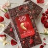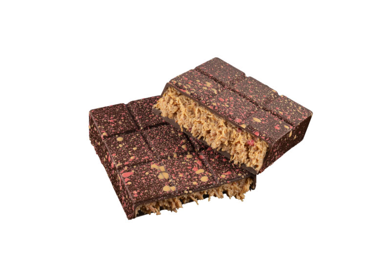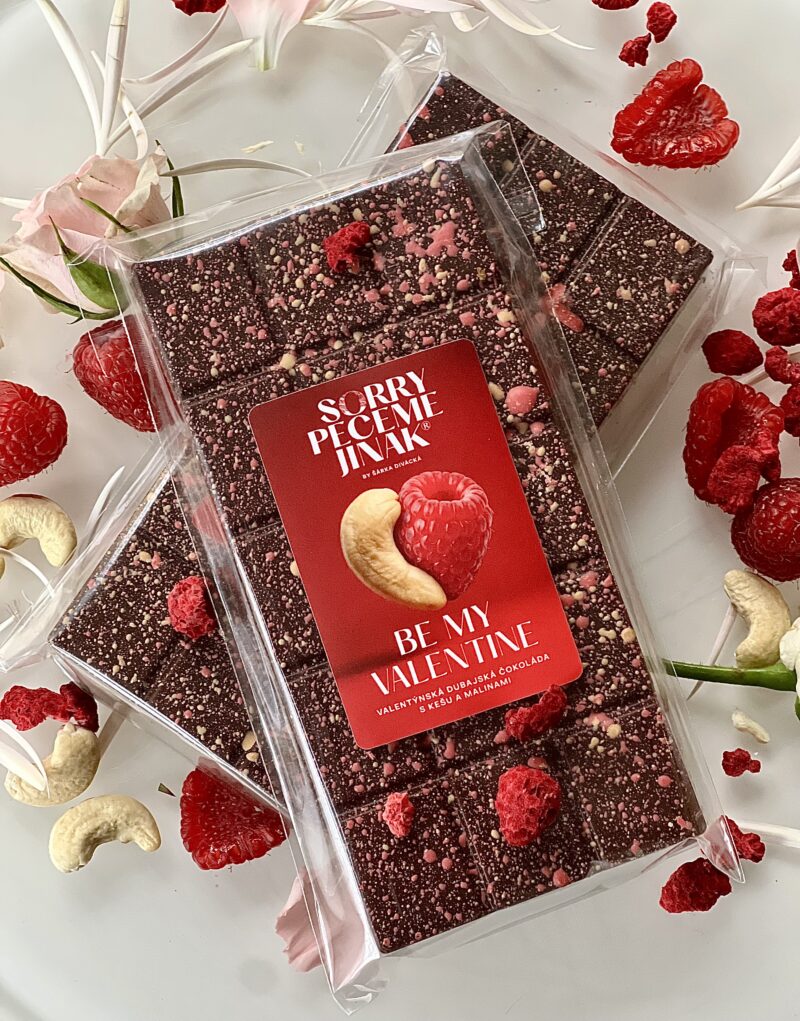 Valentýnská dubajská čokoláda s kešu a malinami - náplň z kešu ořechů, lyofilizovaných malin a křupavého kataifi těsta v mléčné čokoládě.